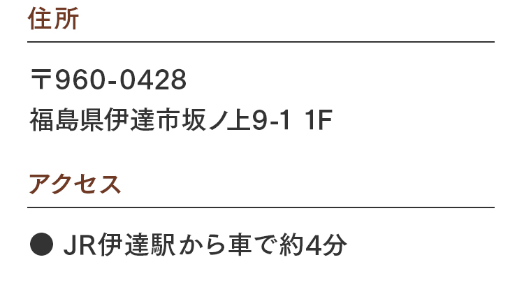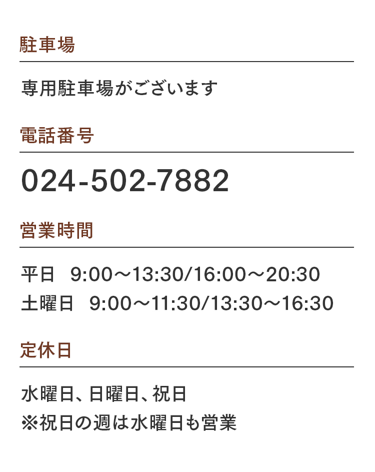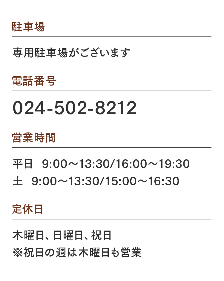 ●9:00~11:30 13:30~16:30休診日:水曜、祝日※祝日の週は水曜は営業※専用駐車場あり